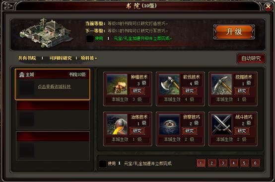 l 由于他们的常用性,所以在此处作为一个快捷的入口,如点击科技研究,则会弹出在书院面板,如下图所示: