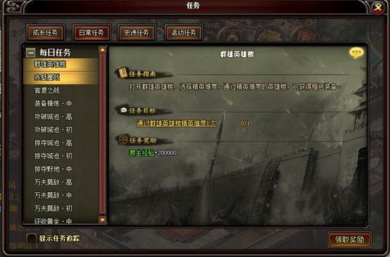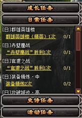 l 此处显示的是已经接受的任务的列表,以类型可区分为成长任务、日常任务、史诗任务和活动任务三块内容,点击任务目标文字,可以帮助玩家自动寻路至目标点,而点击其他区域则会弹出详细的任务面板。