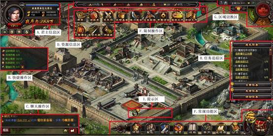 l 界面右上角是区域切换区,是切换剧情/城池/地图的地方,此外还有查看世界地图,回到主城坐标,选择城池,打开排行榜和小助手的功能。