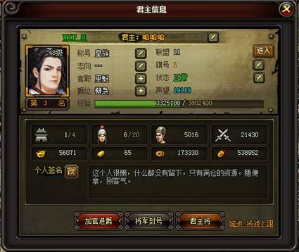 如点击玩家头像,则会弹出君主的详细信息界面,如下