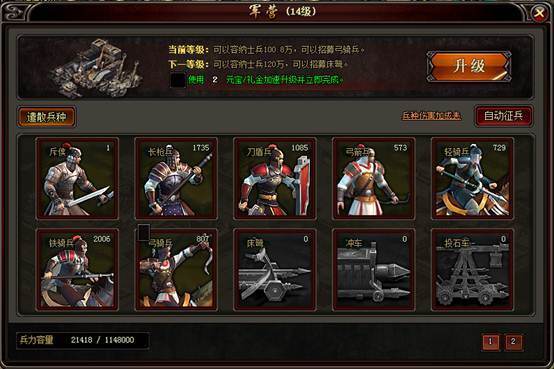 l 提升军营等级可以提升军力上限,并开放高级兵种。特殊兵种需要要塞支持。