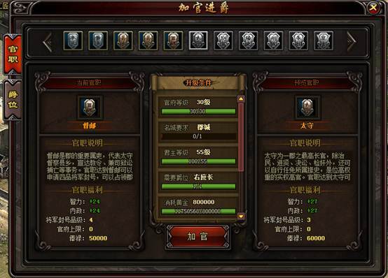 1. 加官进爵主要需求:主城官府等级、玩家等级、声望、黄金以及夜明珠、珊瑚等珠宝