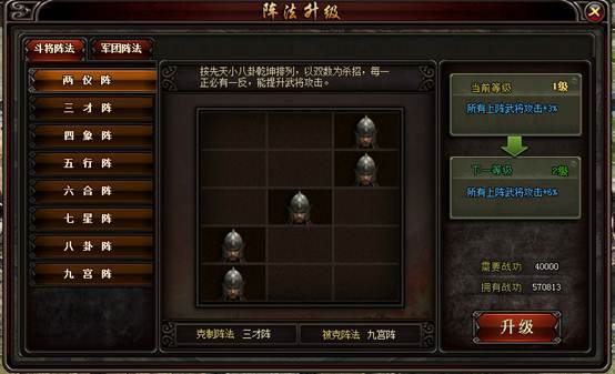 l 阵法升级需要消耗战功,阵法上限与校场等级挂钩。