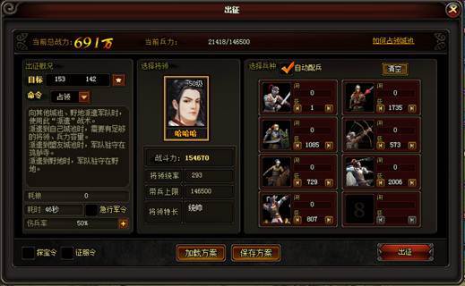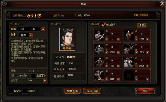 l 选择占领之后,将会进入出征界面,配置兵力后将对该格子进行攻击