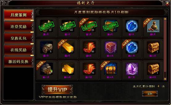 2) 每日均可获得一份奖励,vip玩家随不同等级可在不同天数拿到双倍奖励。