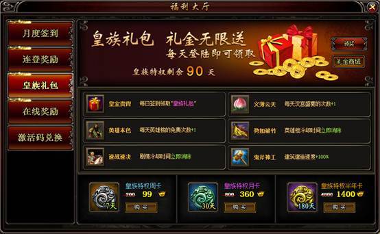 1) 该界面可查看皇族礼包的特权,以及购买皇族特权卡